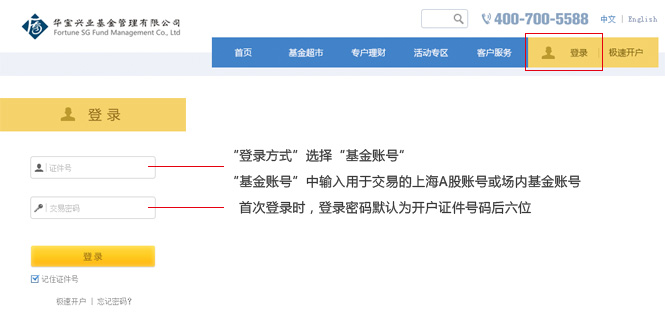 登陆华宝基金公司官方网站www.fsfund.com,进入"e网金"账户查询系统。