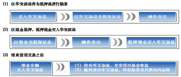 (1)通过融资融券账户只能买卖华宝添益,暂时无法进行申赎。